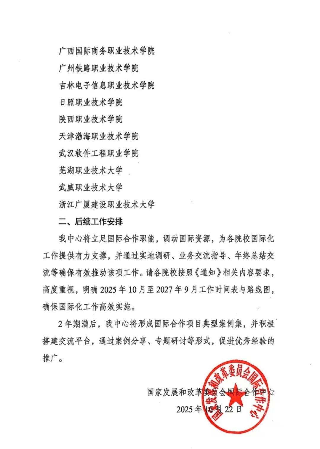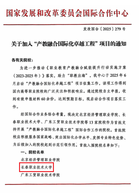 近日,国家发展和改革委员会国际合作中心公布“产教融合国际化卓越工程”首批入选院校名单,长春职业技术大学凭借雄厚的办学实力、卓越的国际化成果与系统的项目规划,成功从全国60余所申报学校中脱颖而出,跻身全国13所首批支持院校之列。