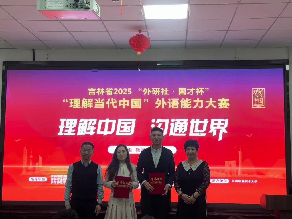 11月8日,2025“外研社·国才杯”“理解当代中国”外语能力大赛教学之星大赛吉林赛区(高职组)比赛在我校成功举办。本次大赛由吉林省教育厅高等教育处和吉林省全面推进《习近平谈治国理政》多语种版本“三进”工作专家组指导,吉林省高校英语类专业教学指导委员会、吉林省高校公共英语类专业教学指导委员会、吉林省高校日语专业教学指导委员会、吉林省高校非通用语种教学指导委员会、吉林省外语学会、外语教学与研究出版社协办,来自全省的12支参赛队伍进入决赛。我校职业基础部英语教研室陈立新团队(成员:李乃超、杨森林、钱睿含、刘春波)参赛并取得金奖(第二名)。